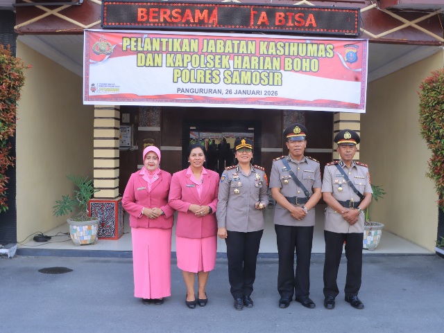 PARAMETERTODAY.COM, Samosir โ Kapolres Samosir AKBP Rina Sry Nirwana Tarigan, S.I.K secara resmi melantik Kasi Humas dan Kapolsek Harian Boho Polres Samosir dalam upacara pelantikan jabatan yang digelar di halaman apel Mako Polres Samosir, Senin (26/1/2026) sore.
